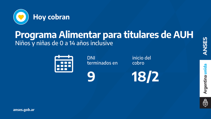 En el marco del Plan Argentina contra el Hambre del Ministerio de Desarrollo Social, ANSES acompaña con el pago del programa Alimentar. Hoy cobran titulares de AUH con documentos terminados en 9 en la misma cuenta de la prestación.