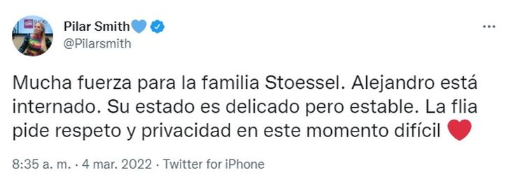 “Mucha fuerza para la familia Stoessel. Alejandro está internado. Su estado es delicado pero estable. La familia pide respeto y privacidad en este momento difícil”, escribió la periodista, sin dar mayores datos.