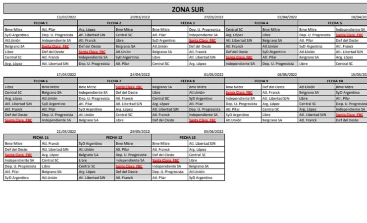 En la Zona Sur, Santa Clara FBC debutará el próximo domingo 13 de marzo en el clásico ante Belgrano en Sa Pereira. Como local, el debut de “La V” será en la segunda fecha ante Unión de Esperanza.