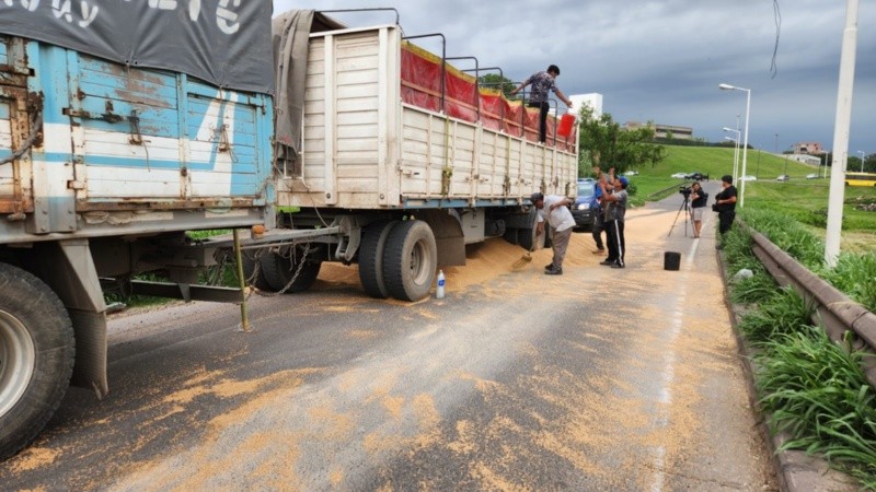 El conductor se desplazaba sobre 27 de Febrero y tomó el acceso a Circunvalación en dirección al sur cuando le abrieron las boquillas del acoplado, al aprovechar un paso a nivel roto que obliga a los vehículos a disminuir la velocidad. En ese sector son recurrentes las aperturas de boquillas de camiones con cereal, lo que representa además un serio riesgo para los demás vehículos que circulan por allí.
